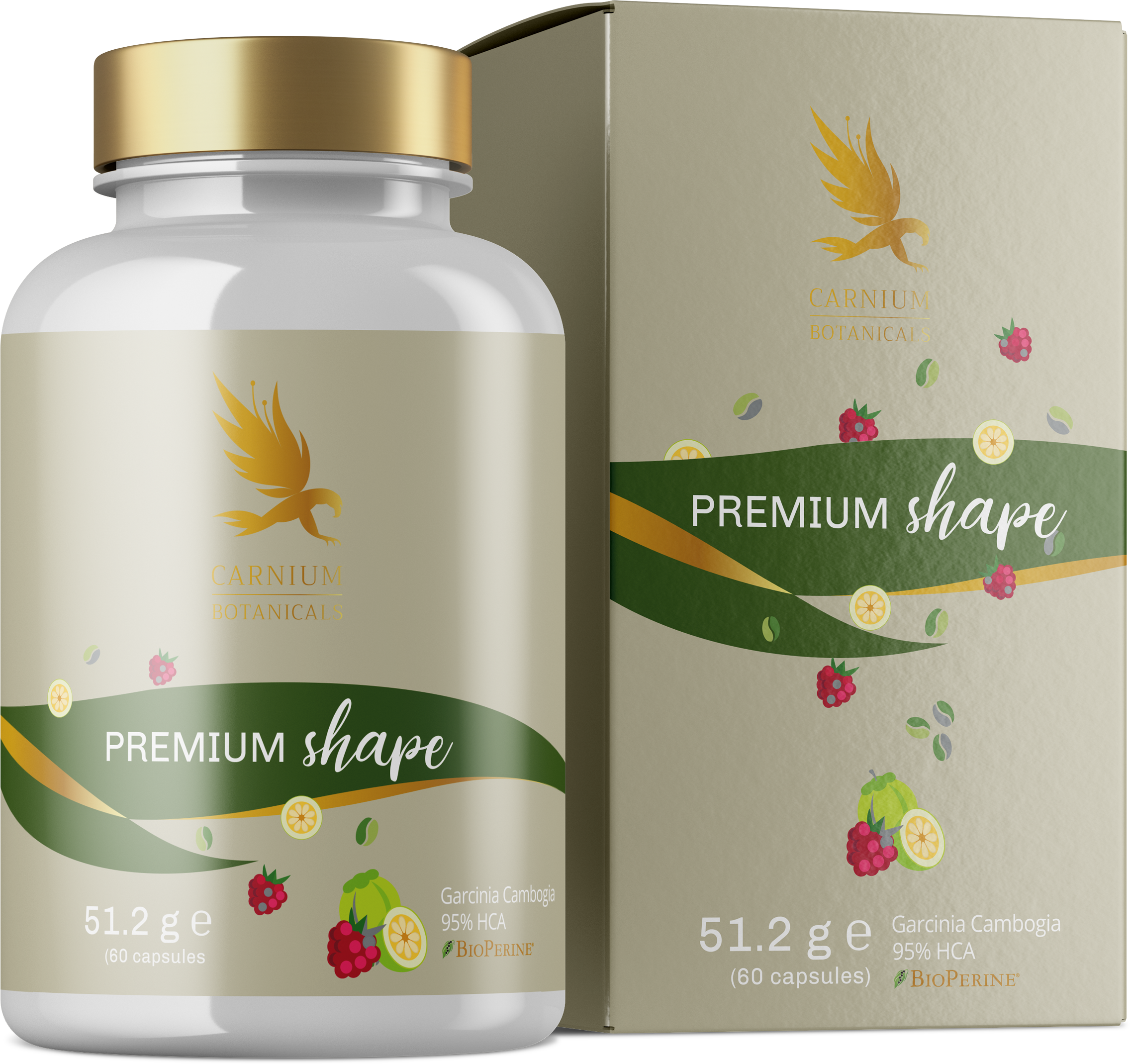 Kapsuly Premium Shape od spoločnosti Carnium Botanicals obsahujú výťažky z čierneho korenia a malín, vitamíny a minerály. Zloženie je vegánske a neobsahuje žiadne konzervačné látky.