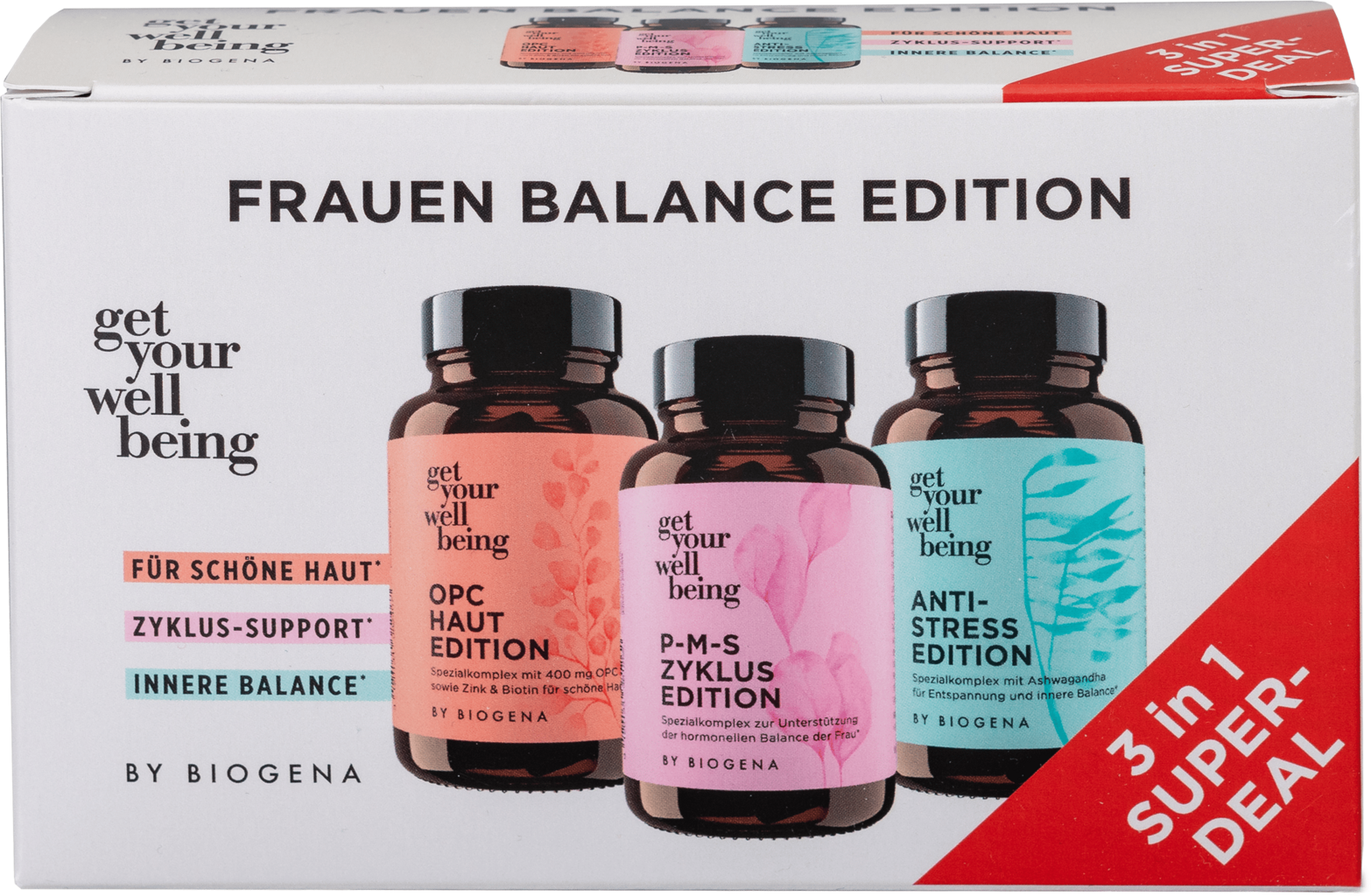 Women's Balance Edition od get your wellbeing by BIOGENA kombinuje tri starostlivo vyvážené prémiové produkty v jednej praktickej sade: OPC Skin Edition s OPC z hroznových jadierok, biotínom a zinkom, Antistress Edition s ashwagandhou, horčíkom a B vitamínmi a PMS Cycle Edition s koreňom yam, ginkgom a ďalšími vybranými mikroživinami - ideálne prispôsobené špeciálnym potrebám ženského organizmu.