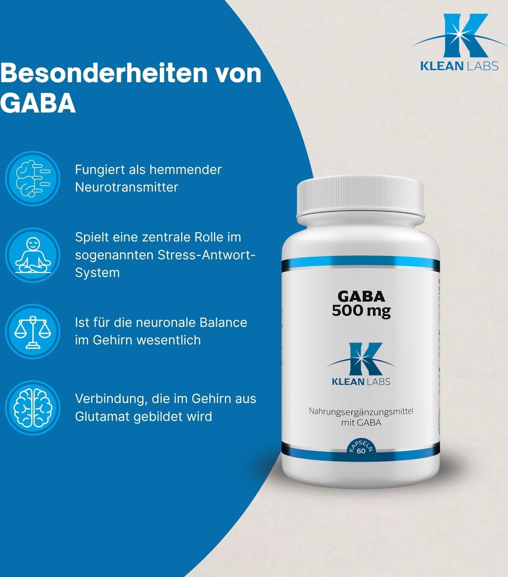 Každá kapsula GABA od spoločnosti KLEAN LABS obsahuje 500 mg kyseliny gama-amino-maslovej. GABA je neurotransmiter a vzniká v mozgu z glutamátu. Kapsuly sú vegánske a bez GMO.