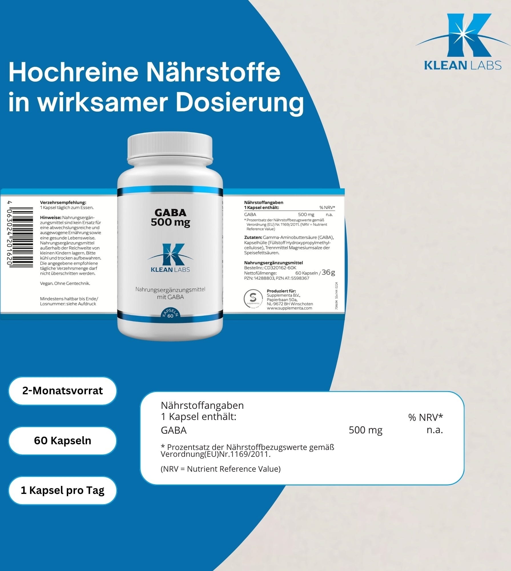 KLEAN LABS GABA 500 mg, 60 kapsúl