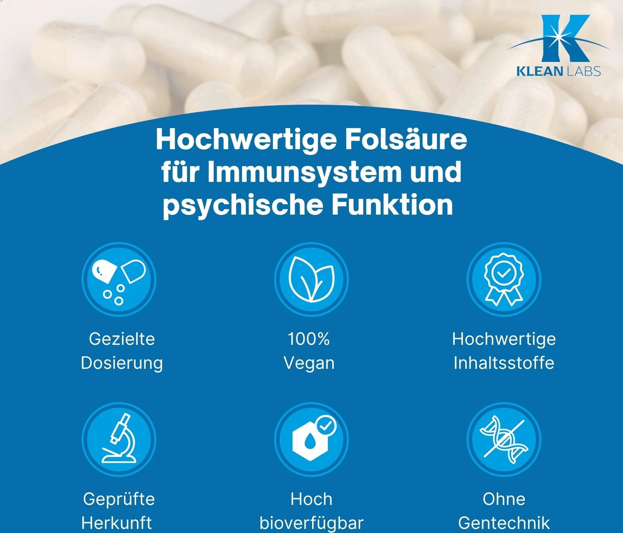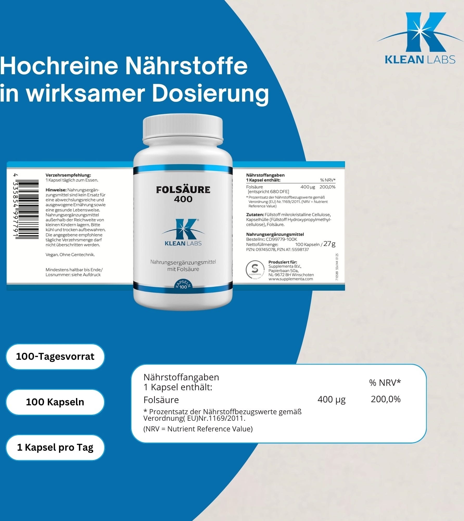 KLEAN LABS Kyselina listová 400, 100 kapsúl