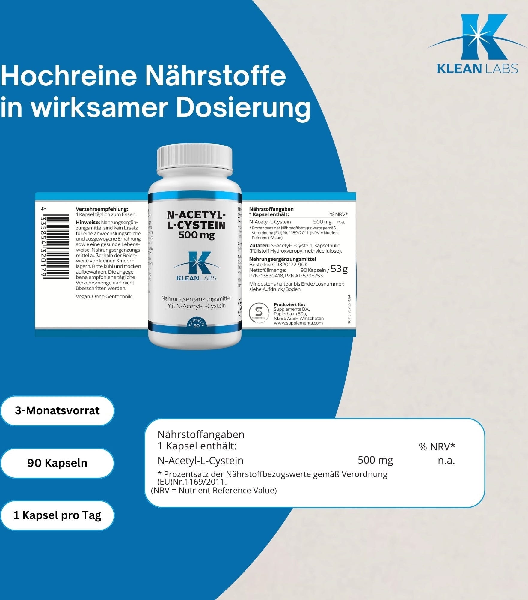 Kapsule od spoločnosti Klean Labs obsahujú 500 mg čistého N-acetyl-L-cysteínu (NAC) v jednej kapsule. Okrem toho je výrobok 100 % vegánsky a bezlepkový.