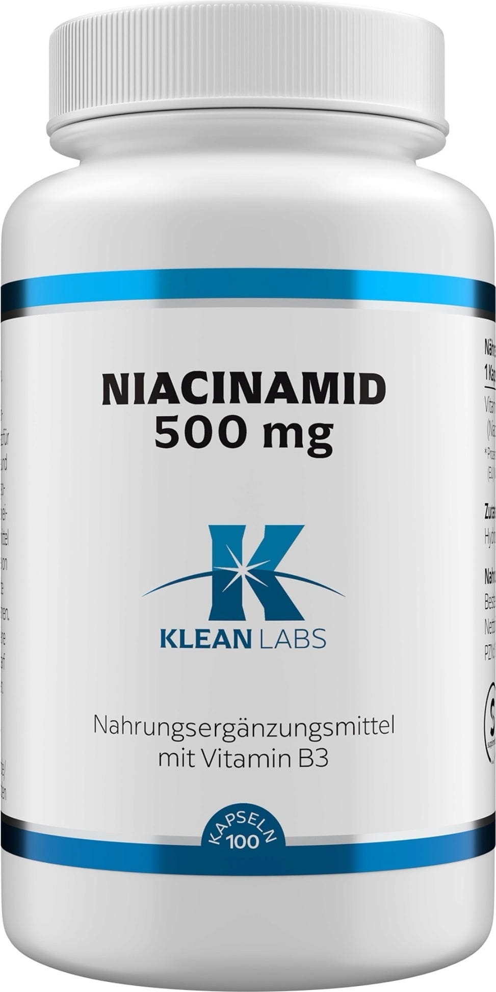 Niacínamid je možno mnohým známejší ako vitamín B3. Tento vitamín sa v tele prirodzene vyskytuje v dvoch formách - ako niacín (kyselina nikotínová) a niacínamid (nikotínamid). Vegánske a bezlepkové kapsuly niacínamidu od spoločnosti KLEAN LABS vám poskytnú 500 mg vitamínu B3 v jednej kapsule.