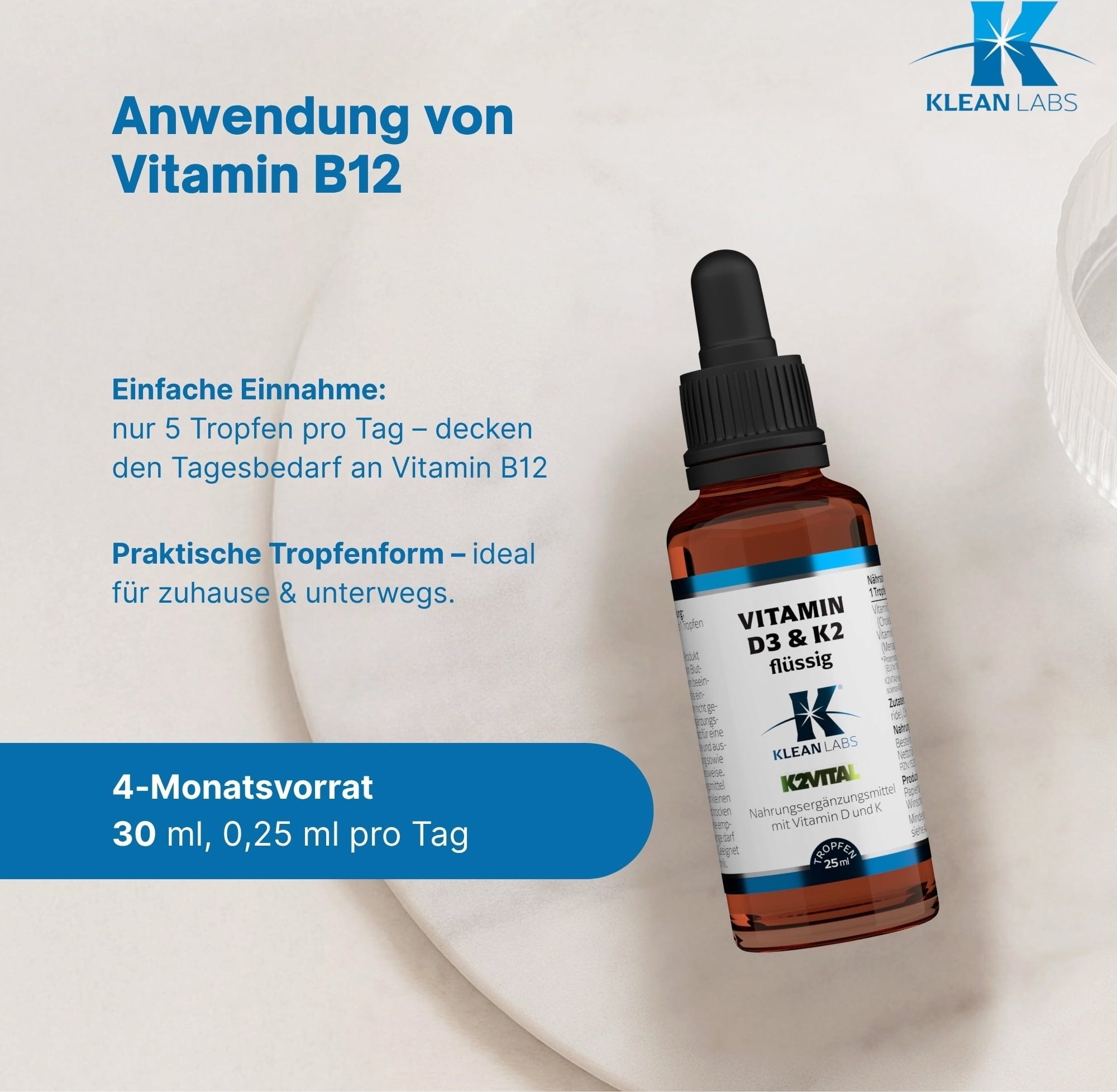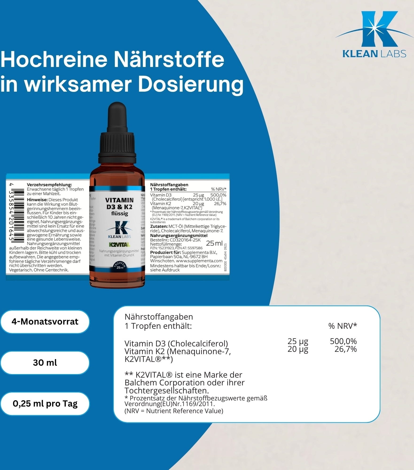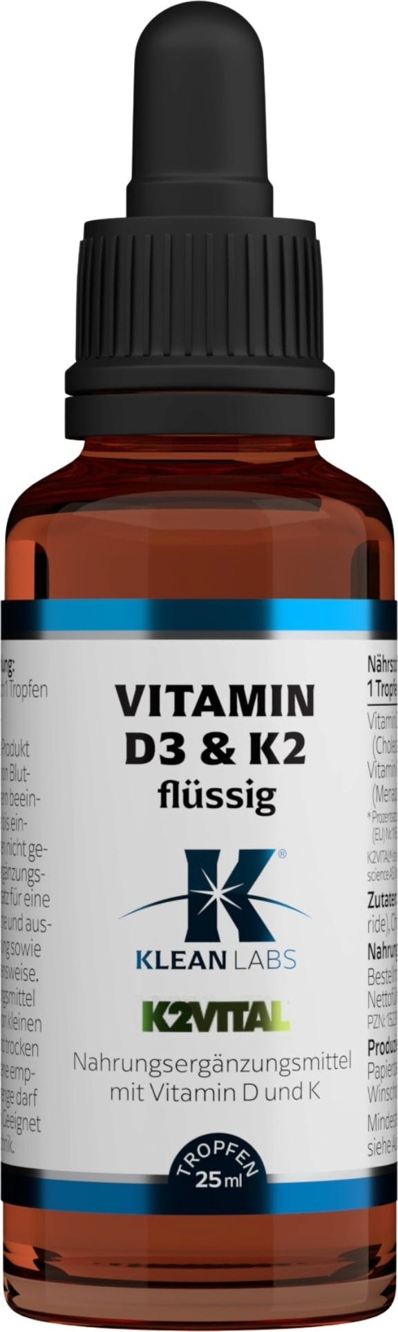 Tento tekutý doplnok od spoločnosti Klean Labs kombinuje vitamín D3 a vitamín K2 (menachinón-7) v jednej fľaštičke. Vďaka olejovému základu na báze kokosového MCT extraktu sa výrobok ľahko dávkuje a môže sa používať priamo. Prípravok neobsahuje žiadne umelé konzervačné látky, arómy ani sladidlá, čím vám poskytuje absolútne čistý produkt. Tekutina tiež neobsahuje GMO, lepok a laktózu.