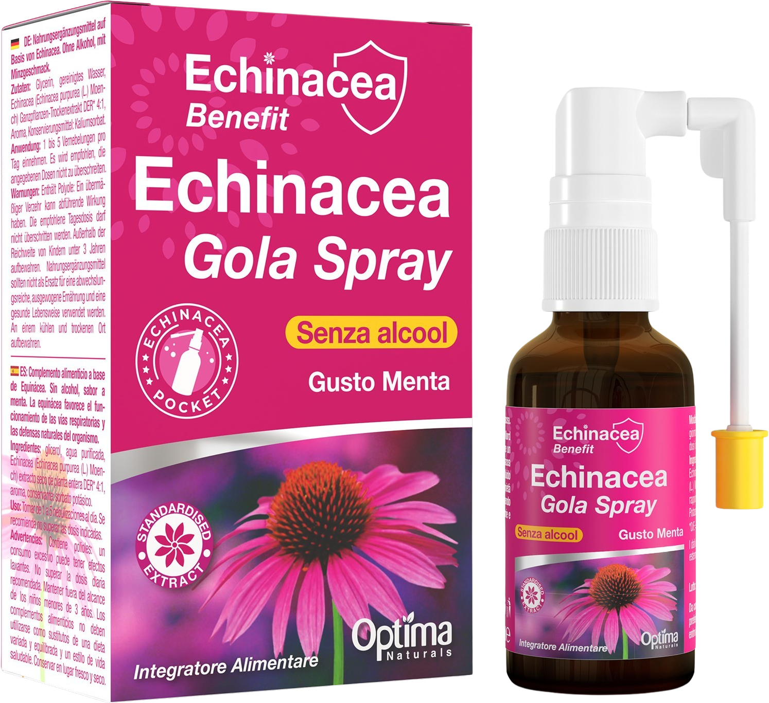 Echinacea Gola od spoločnosti Optima Natrurals je prírodný sprej Echinacea purpurea. Používa sa extrakt z celej rastliny. Je vyrobený bez alkoholu. Jemná mätová príchuť dokonale dotvára chuť.