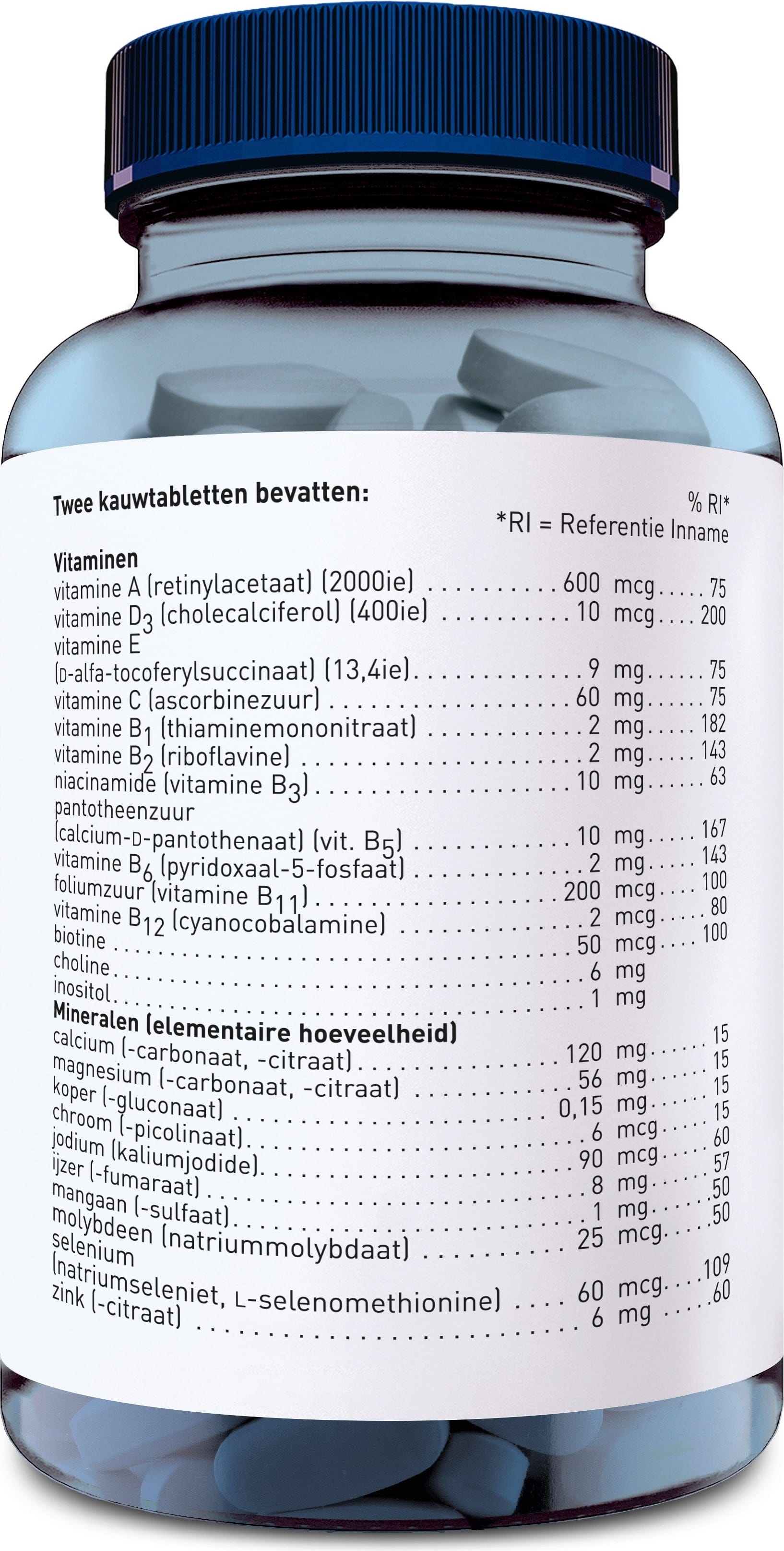 Vápnik (Calcium carbonate, Calciumcitrat), Sladidlo (Dextróza), Horčík (Magnesiumcarbonat, Magnesiumcitrat), L-askorbová kyselina, Zinc citrate, Farbivo (Prášok z červenej repy), Sladidlo (Xylitol), Protihrudkujúca látka (Mastné kyseliny, Oxid kremičitý, Horčíkové soli mastných kyselín), Arómy (Malinová príchuť), Niacinamide, Vitamín B5 (pantotenát vápenatý), acidulant (Kyselina citrónová), Vitamín E (d-alfa tokoferol), Fumarát železnatý, Choline bitartrate, Síran manganatý, Riboflavín, Thiamine mononitrate, Pyridoxal-5-Phosphat, Meďný glukonát, Inozitol, Vitamin A (Retinylacetat), Kyselina listová, Sodium selenate (selenium) (Sodium selenite, L-selenomethionín), Potassium iodide, Sodium molybdate, Biotín, Vitamín D3 (cholekalciferol), Chrom Picolinate, Cyanokobalamín