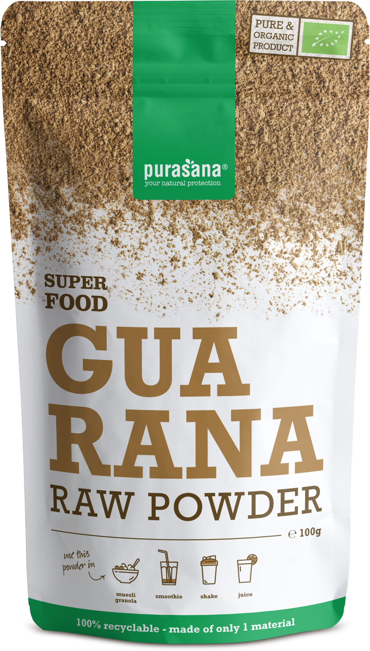 Guarana, Paullinia cupana, je popínavá rastlina v Amazónii. Bio guarana prášok od Purasany obsahuje mleté semená a plody. Guarana obsahuje kofeín, ktorý sa na rozdiel od kávy vstrebáva do tela pomalšie.